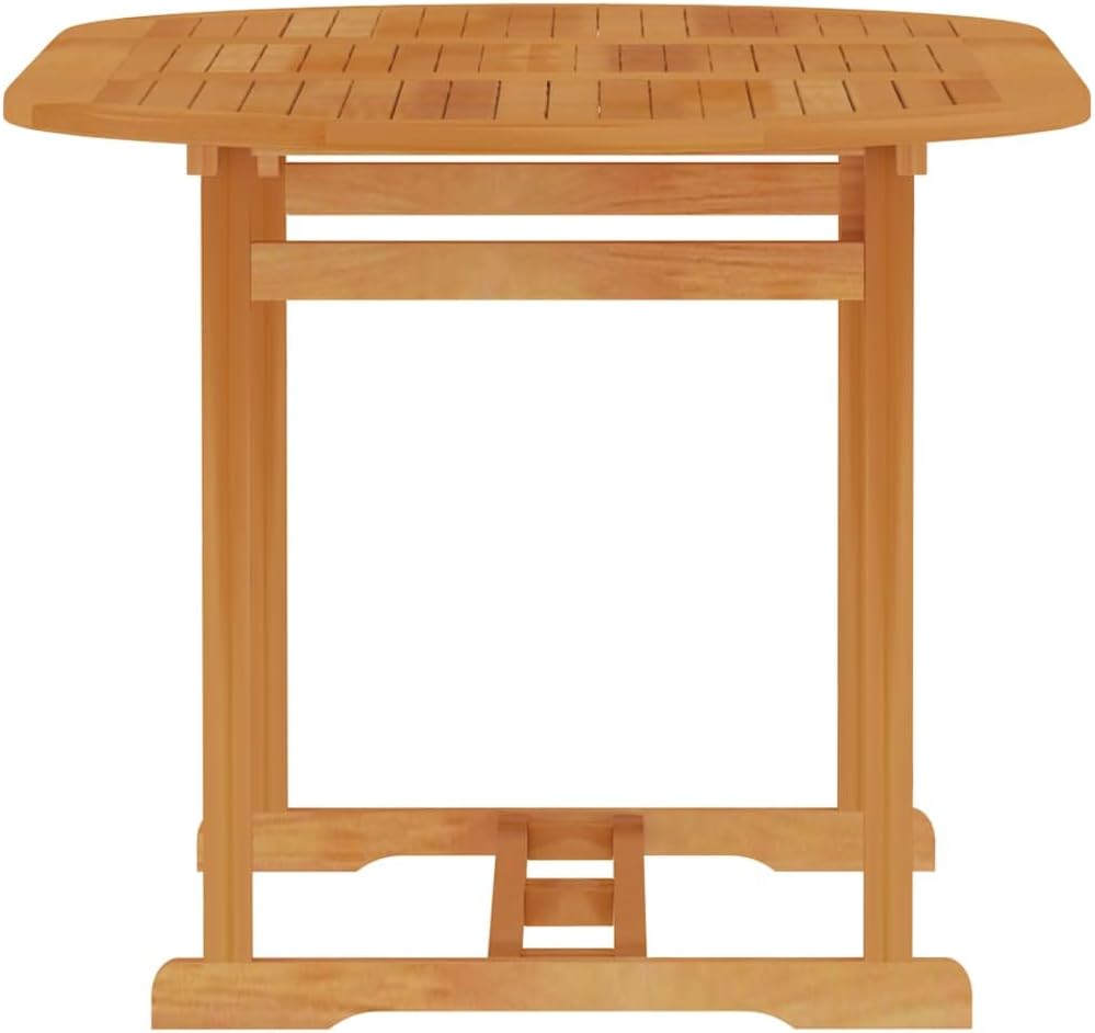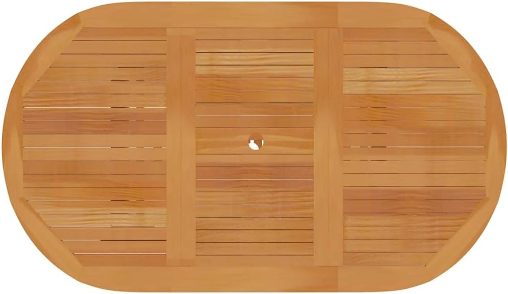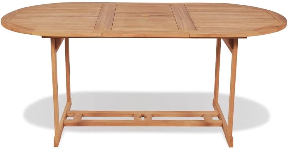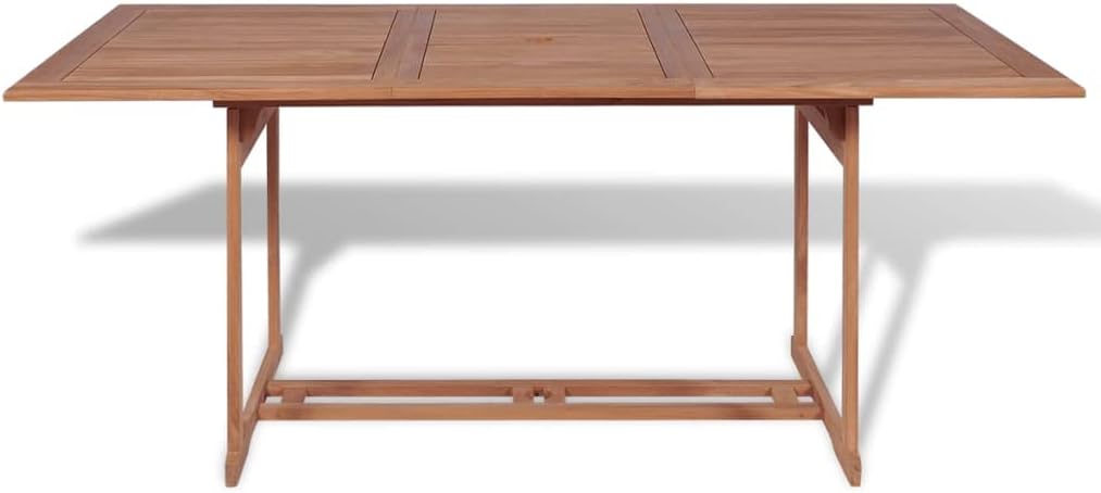 This teak patio dining table has a classic design and is perfect for al fresco dining in the garden or on the patio.Constructed from extremely durable teak hard wood, this piece of teak furniture has been seasoned, kiln dried and then fine sanded to give a very smooth appearance. Teak wood is known for its exceptional strength and weather resistance, making it far more suitable for patio furniture than any other kind of wood. Teak wood is the perfect choice if you want to purchase a long lasting piece of patio furniture.The surface is easy to clean with a damp cloth. The tabletop has a parasol hole, so you can enjoy the summer breeze without worrying about the burning sun. The wooden product is applied with beautiful finish to give the wood a warm color. Delivery includes 1 dining table. Please note that a parasol is not included in the delivery.Material: Fine sanded teak hard wood with waterbase finishDimensions: 70.9" x 35.4" x 29.5" (L x W x H)Tabletop with parasol hole (parasol not included)Parasol hole diameter: 2"